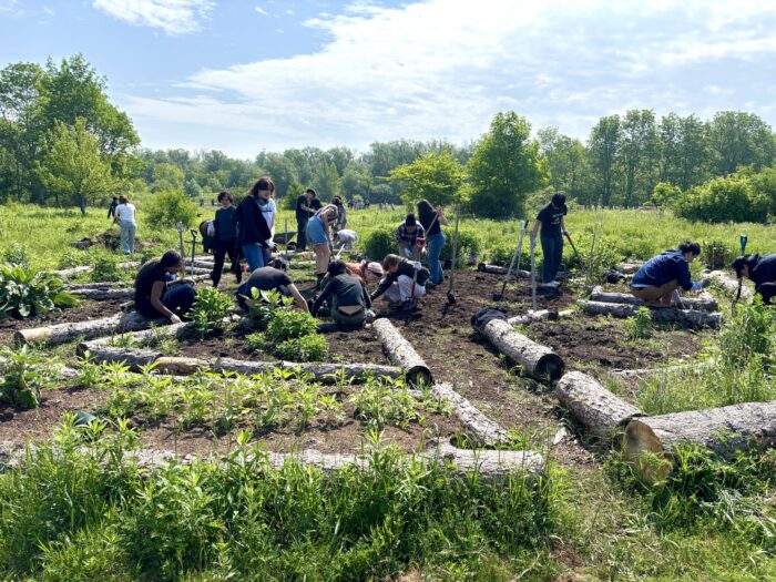 Waterloo architecture students working at the Wiijindamin land restoration site, designed by a team lead by Mkomose, located in Kitchener, ON.